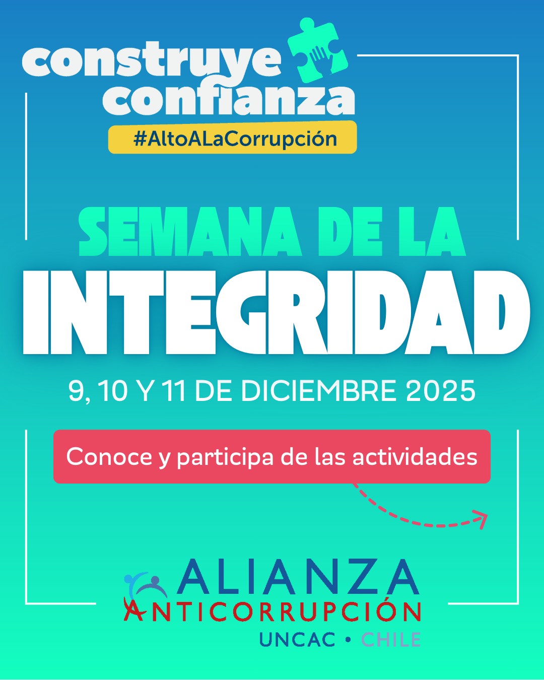 En el marco del Día Internacional contra la Corrupción, que se conmemora cada 9 de diciembre, la Alianza Anticorrupción UNCAC-Chile desarrollará una serie de actividades como parte de la Semana de la Integridad. Esta iniciativa multisectorial, que reúne a instituciones públicas, privadas, academia y sociedad civil, busca fortalecer la probidad pública y avanzar en la implementación de la Convención de las Naciones Unidas contra la Corrupción (UNCAC), consolidando espacios de diálogo y coordinación de manera transversal.
